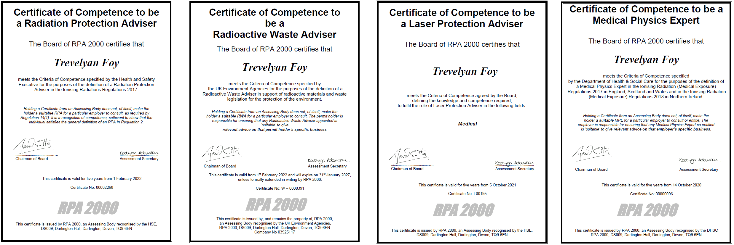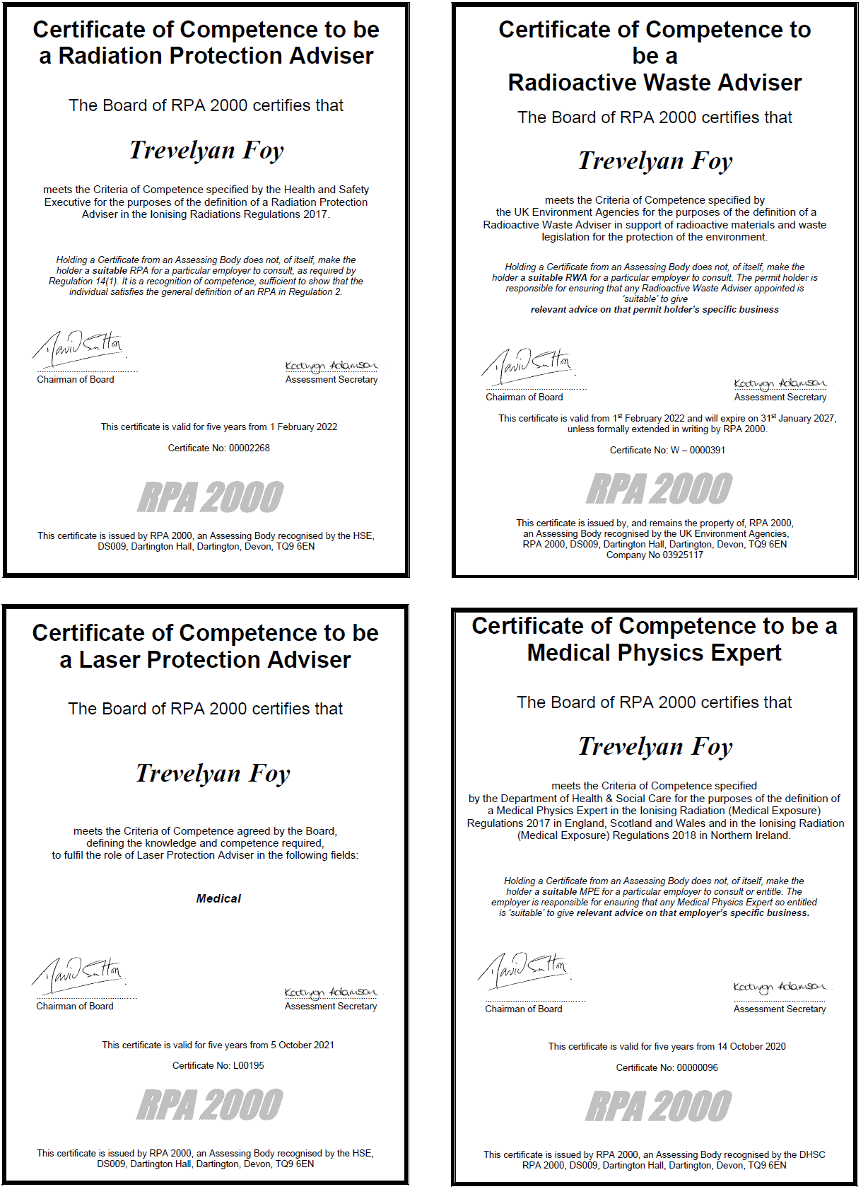 Trevelyan is an assessor for RPA2000, the body nominated by the HSE to assess the competence of RPAs at initial certification and every 5 years.
